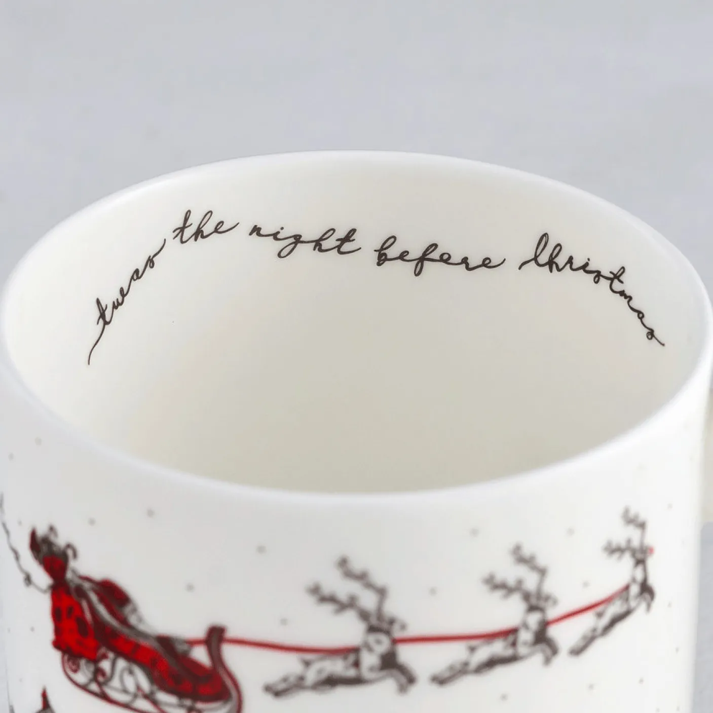 The beautifully hand illustrated Santa’s Sleighcollection highlights a magical and nostalgic view of Christmas. The traditional festive legend sees reindeer pulling a Father Christmas in a sleigh through the night sky to deliver gifts to children on Christmas Eve. As they fly silently over a snowy picturesque English town people below go about their last minute preparations unaware of the magic happening above them.This fine bone china mug is certain to make you smile whilst enjoying your cuppa.