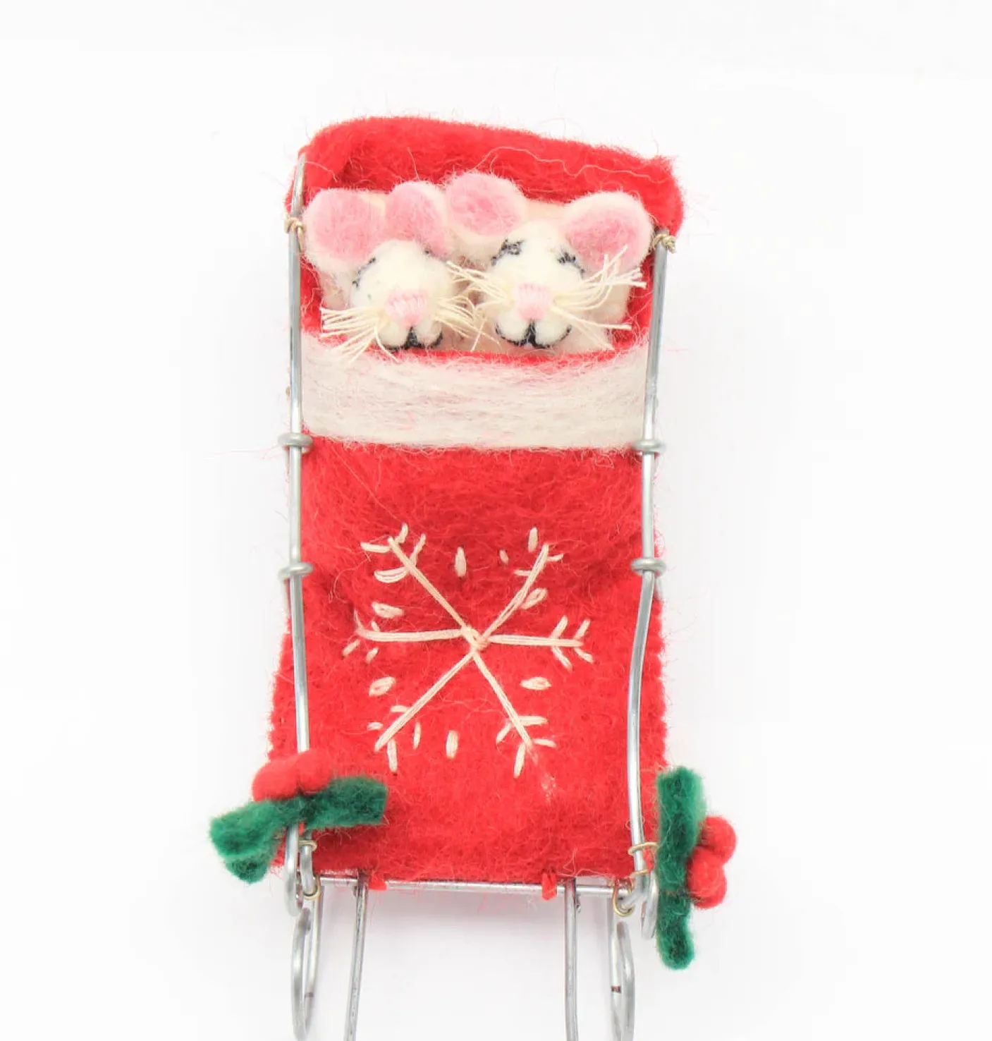 These two mice are off for a winter wonderland sleigh ride with Rudolph.