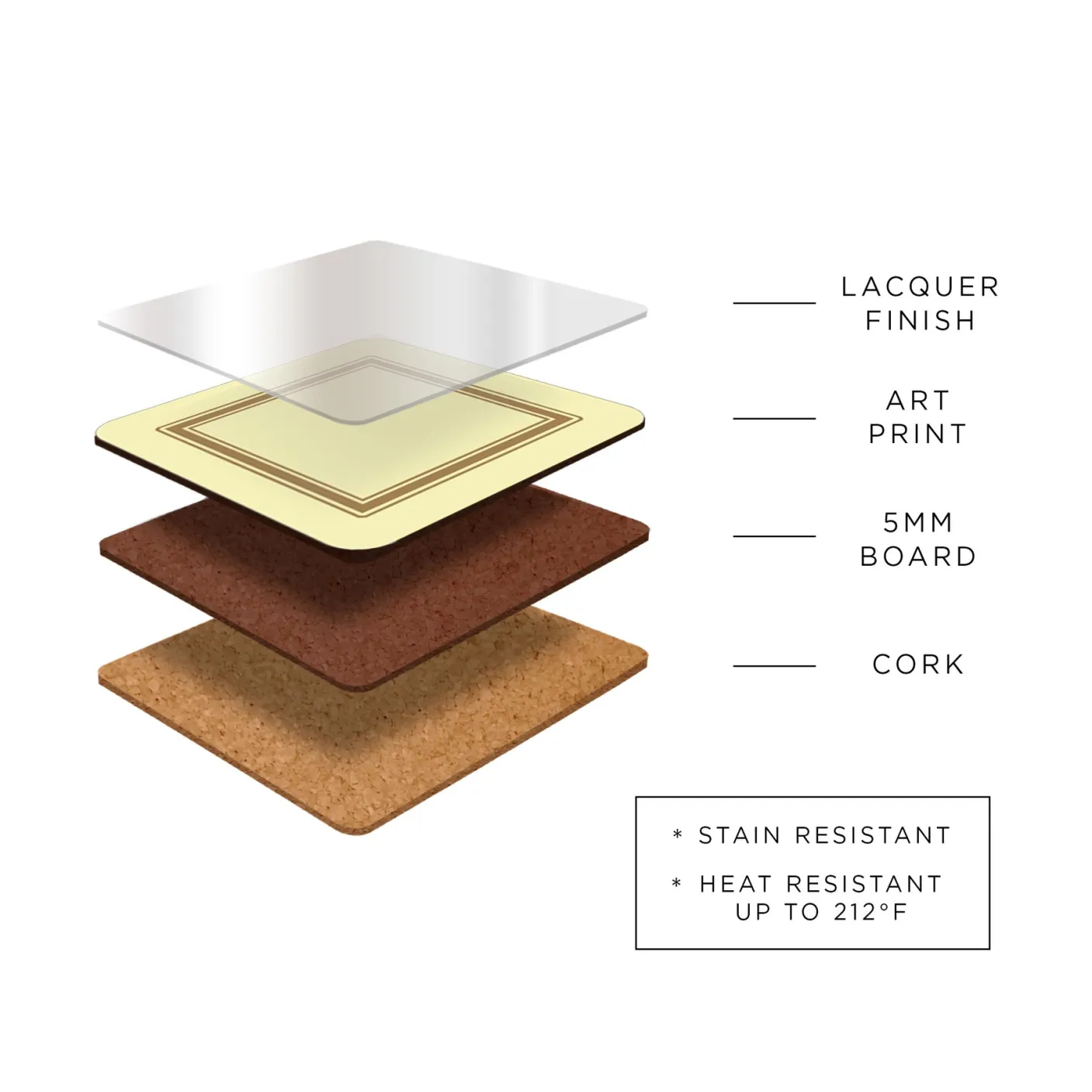A fresh update to a classic, these Brocato coasters feature a modern redesigned border reminiscent of the iconic Blue Italian design with a lighter approach. These quality coasters use a 5mm board topped with the unique art print. Each is totally sealed with a high quality coating that is both stain and heat resistant to 212°F . The coaster is then finished with a hardwearing cork back to protect surfaces. You will also find the perfect placemat to match.