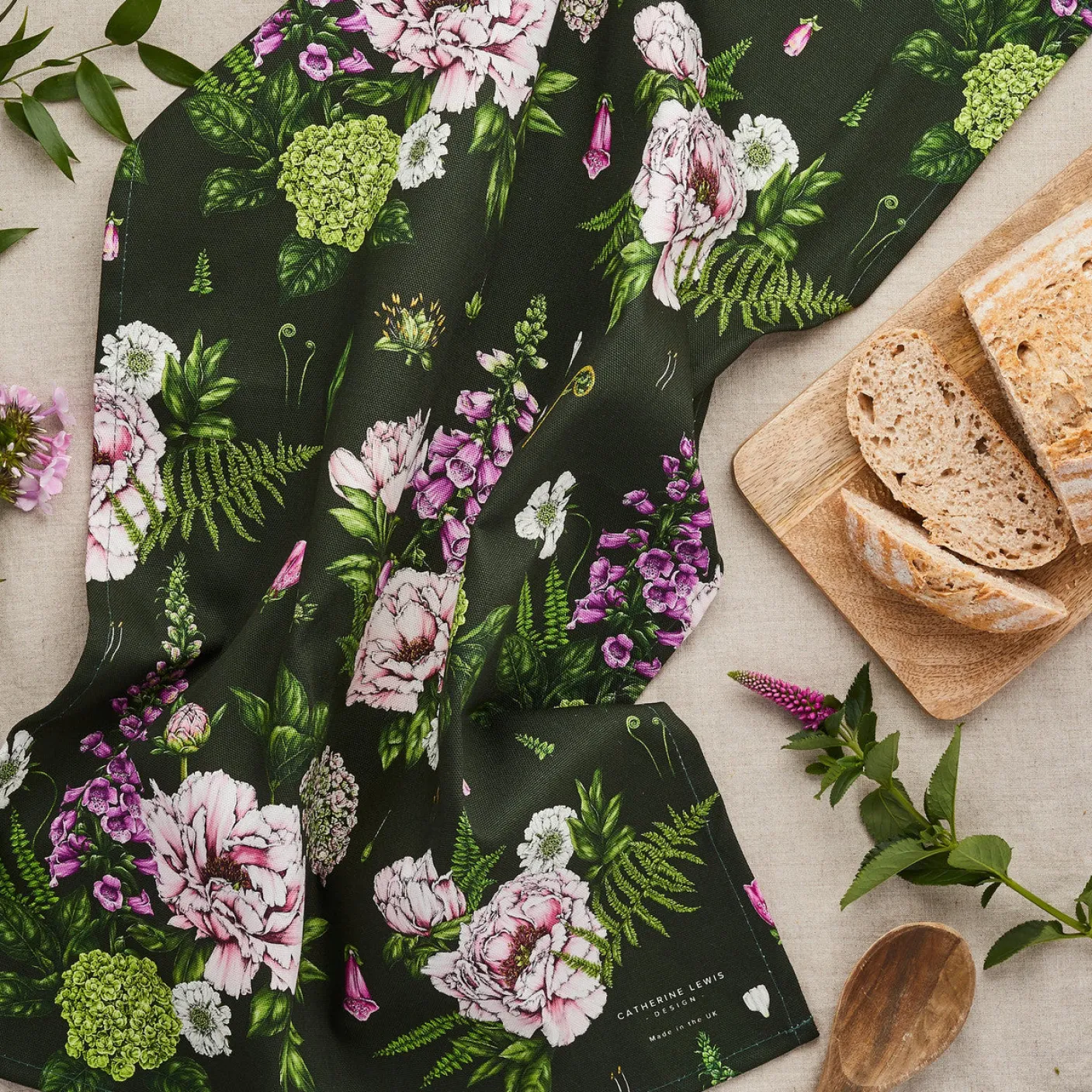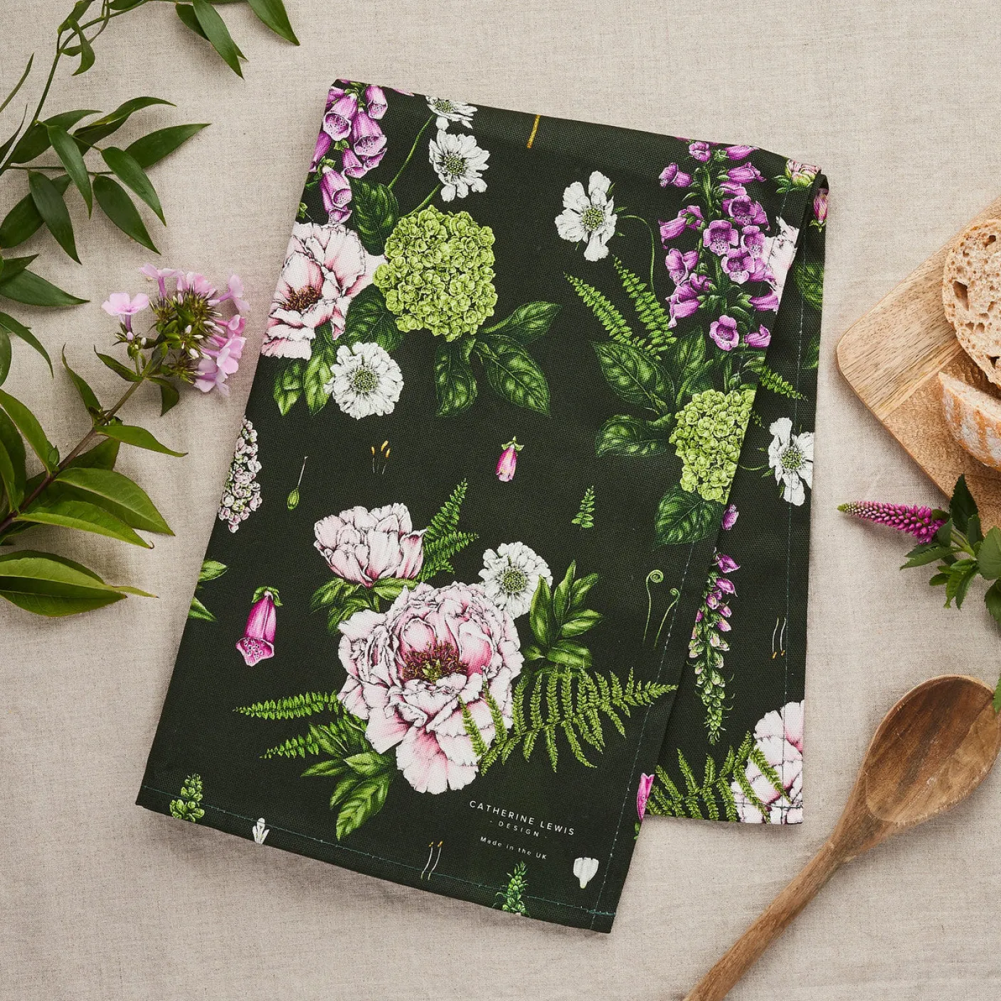 Intricately drawn Summer Garden Tea Towel design on a dark green base. Printed on a high quality thick 100% Organic Cotton and made right here in the UK.